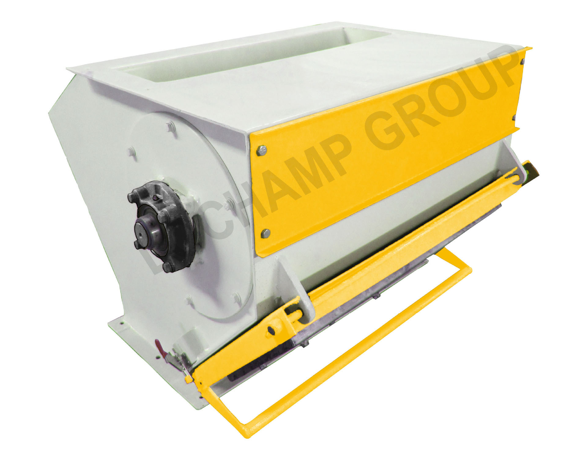 - a delivery device is used to introduce the material to be ground into the path of the hammers. A rotor comprised of a series of machined disks mounted on the horizontal shaft performs this task.
